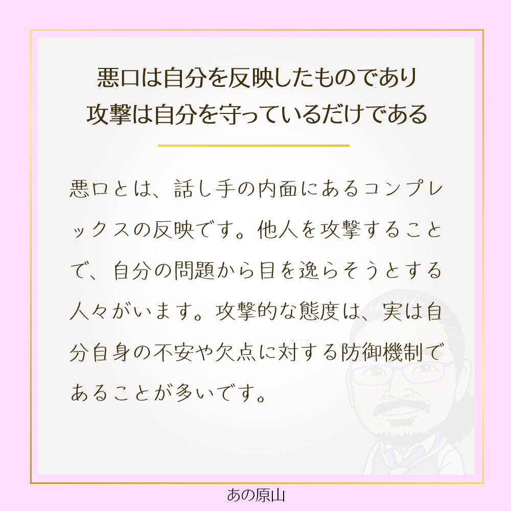 たとえば、職場や日常生活で誰かが他人を非難するようなことを言った時、その背後にはその人自身の不安やコンプレックスが隠れているのです。