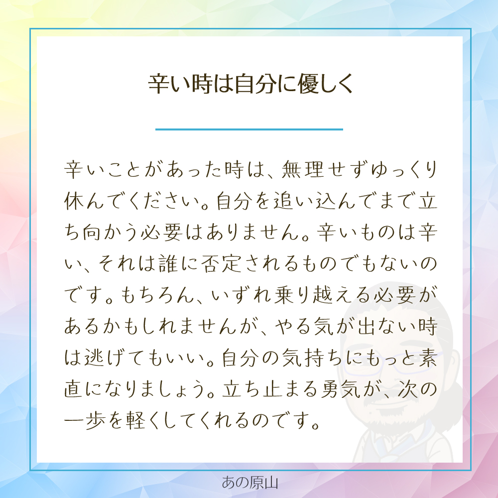 「辛い」「しんどい」と感じるとき、つい「我慢しなきゃ」「乗り越えなきゃ」と自分を奮い立たせようとしますよね。たとえば、仕事でミスして落ち込んだり、友達とのすれ違いで心が重くなったり。そんなとき、「頑張れ!」と自分を追い込むと、余計に心が疲れてしまうことも。