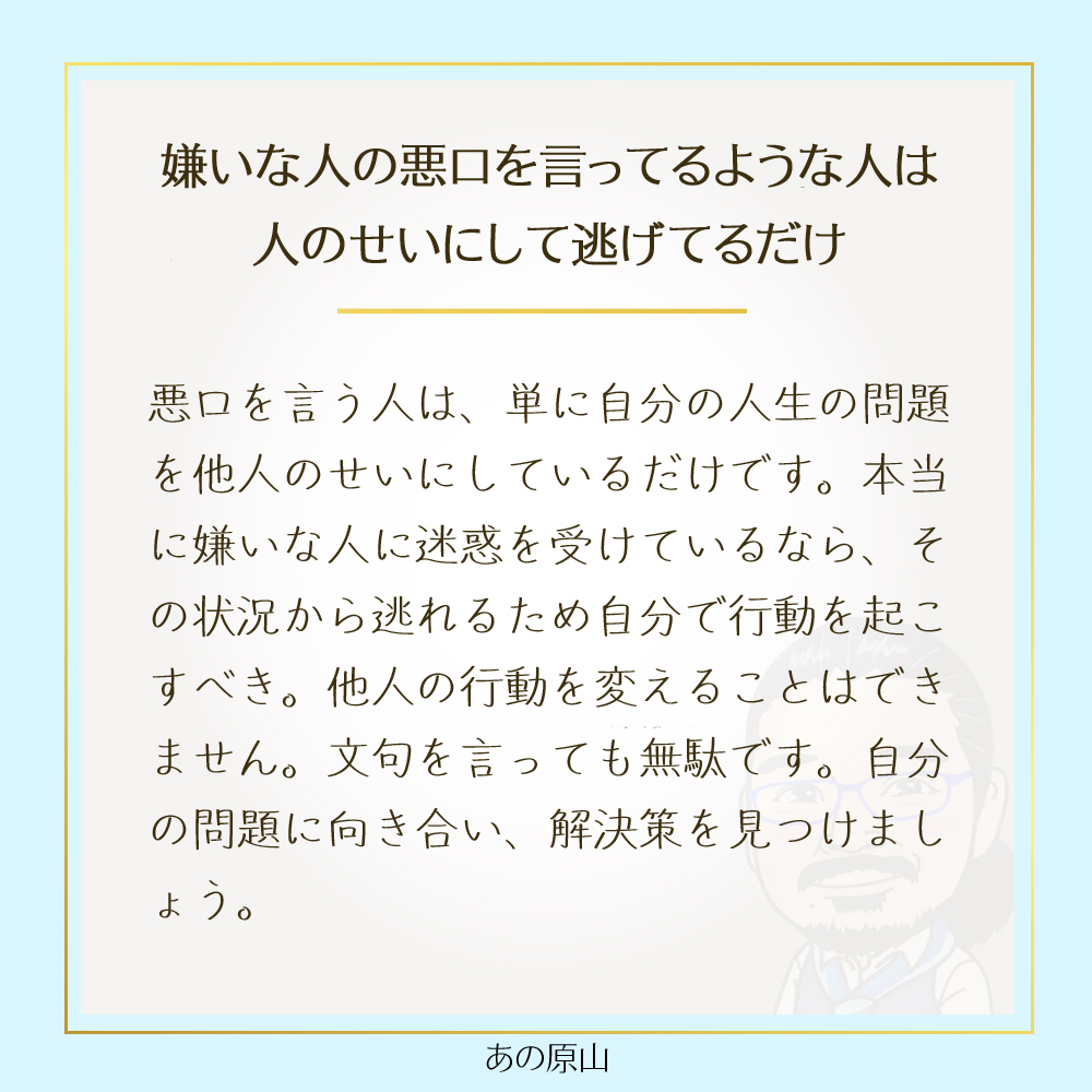 悪口を言う人の多くは、自分の人生の問題を他人のせいにしているだけかもしれません。