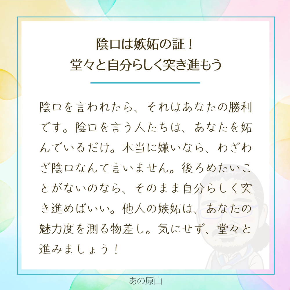 陰口とは、妬みや嫉妬の現れであり、あなたの魅力や行動が誰かの心をざわつかせているからこそ、わざわざ陰で言葉にしているのです。