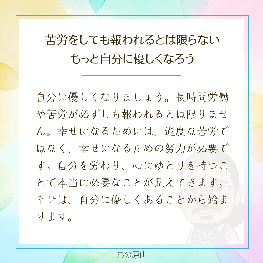 幸せは、頑張り続けることで得られるものではなく、自分を大切にすることで自然と生まれてくるものです。