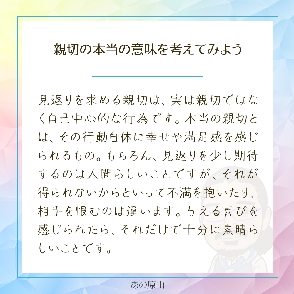 誰かに親切にすると、つい「ありがとうと言ってほしい」「何かお返しが欲しい」と思ってしまうこと、ありますよね。たとえば、友達に時間を割いて相談に乗ったのに反応が薄かったり、同僚に手助けしたのに感謝されなかったり。そんなとき、「なんで?」と不満やモヤモヤを感じてしまう。でも、実は見返りを期待する親切は、自己中心的な気持ちが隠れているのかもしれません。