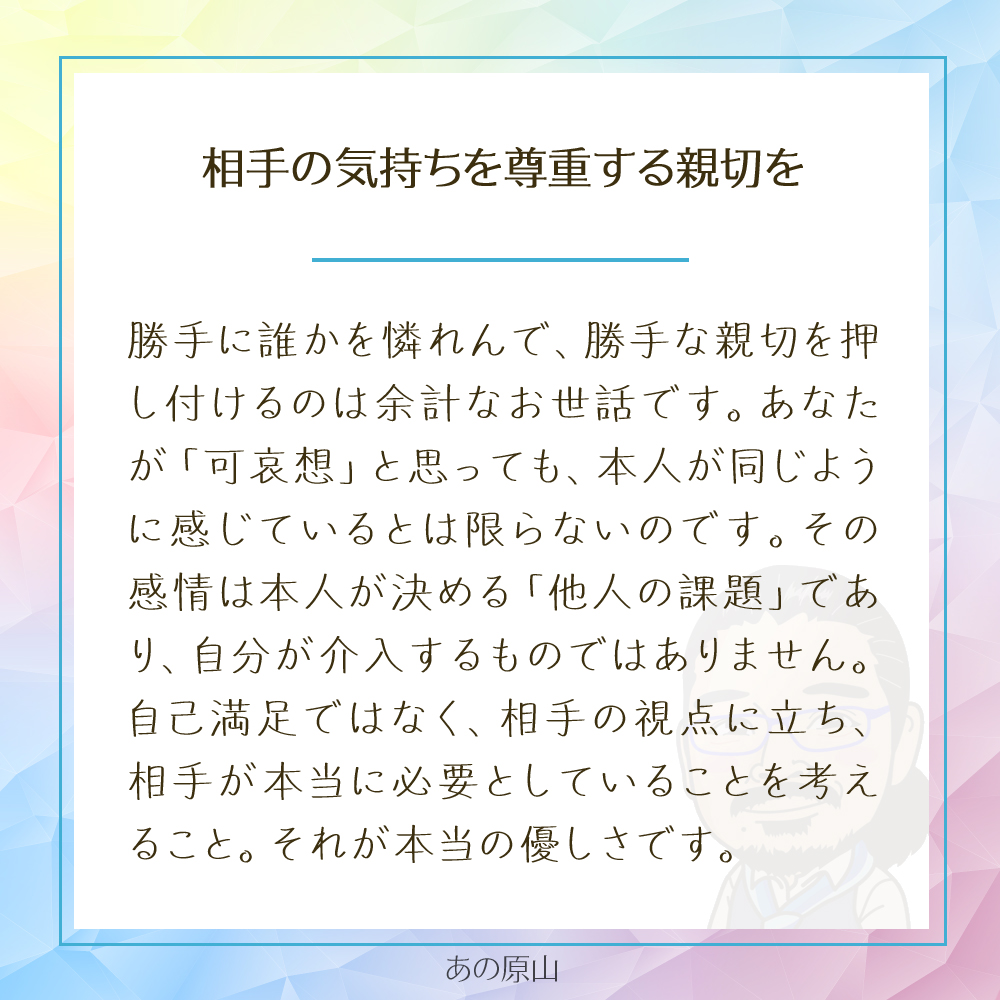 勝手に憐れんで押し付ける親切は、相手を困惑させるだけ。相手の視点に立って、必要なことを考えるのが本当の優しさです。たとえば、週末に友達に「いつでも話聞くよ」と伝える、家族に「何か手伝う?」と聞く、近所の人に笑顔で挨拶する。そんな小さな行動が、相手の心に届きます。