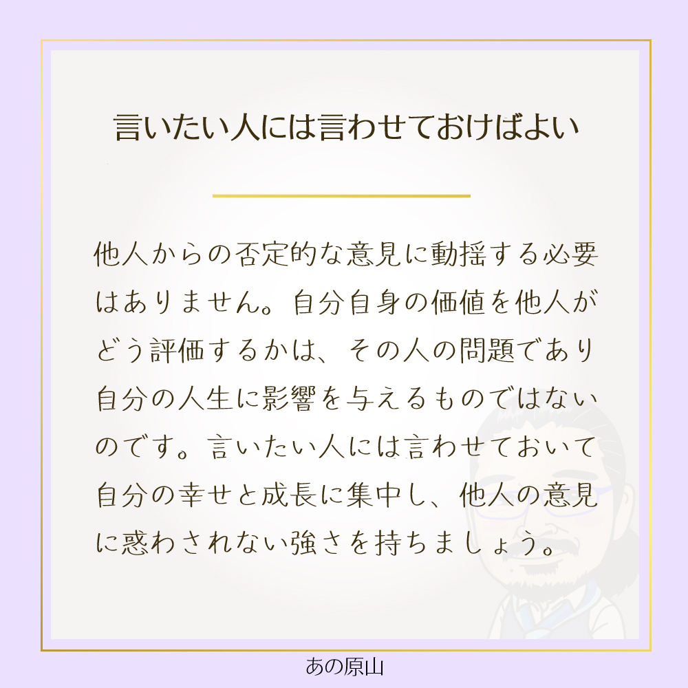 だからこそ、他人の意見に左右されず、自分自身の幸せと成長に集中することが大切です。