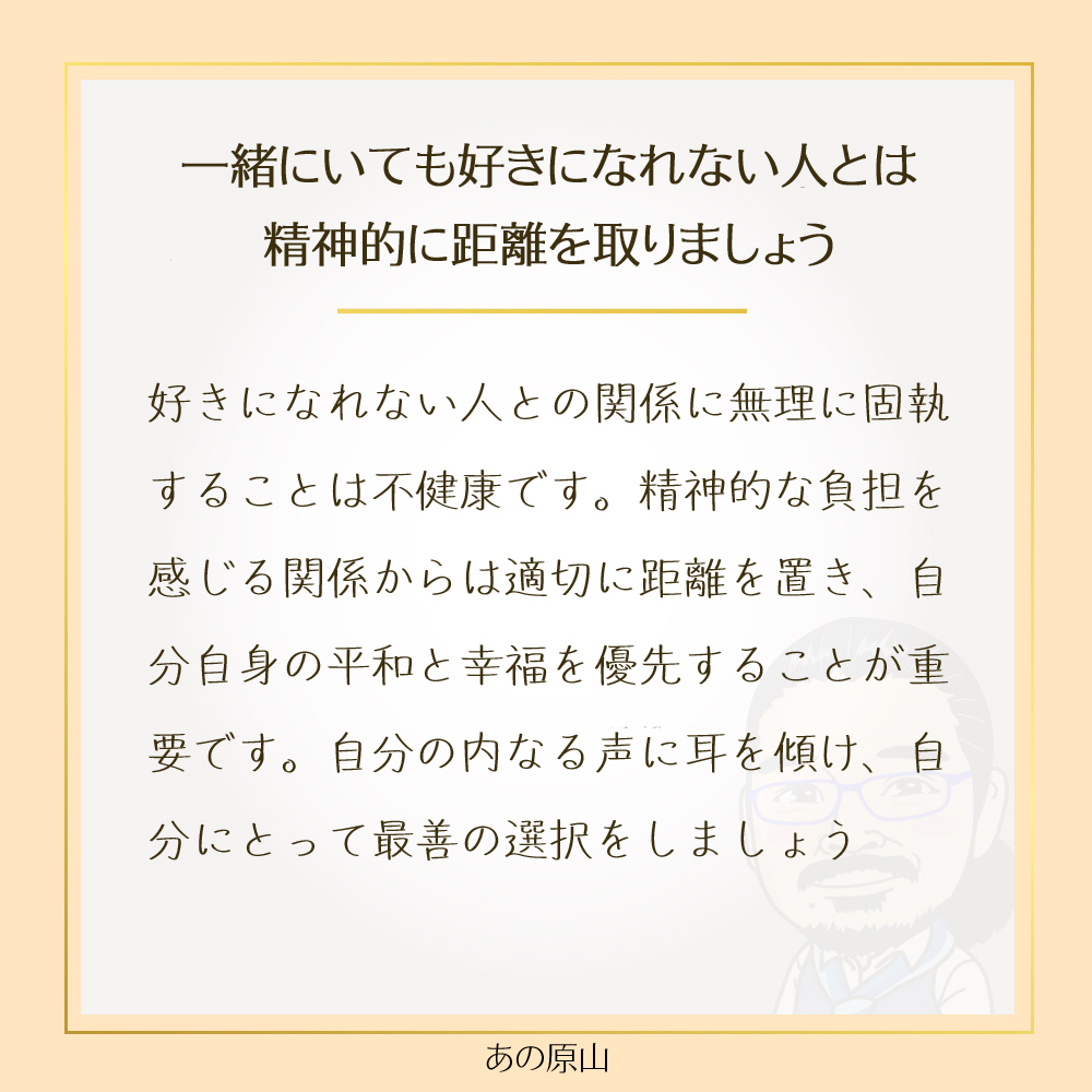 これらの方法を実践することで、好きになれない人との無理な関係に縛られず、自分自身の平和を保つことができます。