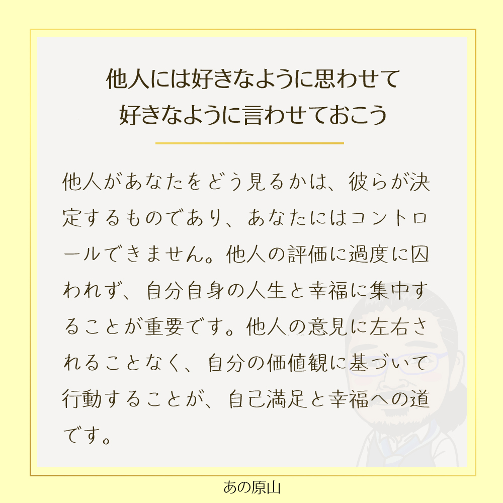 他人には好きなように思わせて、好きなように言わせておこう。という言葉の通り、他人があなたをどう見るかは、彼ら自身が決めることです。