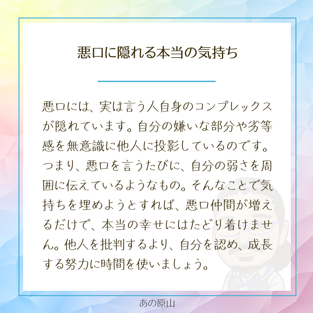 人の悪口を言うたびに、自分の心の中のコンプレックスや未整理な感情が深まってしまう。