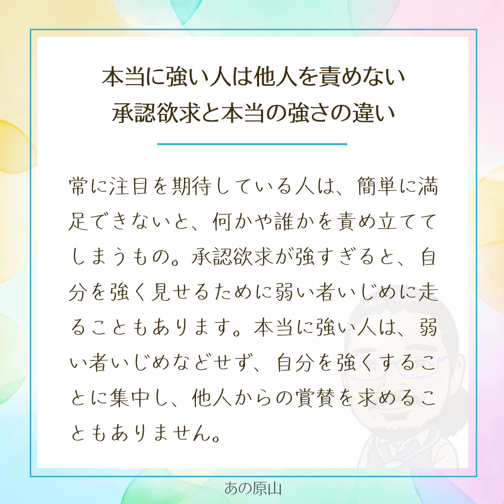 承認欲求が強い人は、「自分が認められないのは誰かのせい」と考えてしまいがちです。その結果、他人を批判したり、弱い立場の人を攻撃したりして、優越感を得ようとすることもあります。でも、本当に強い人は、そんなことはしません。むしろ、自分をしっかり持ち、他人を認めることができる人こそ、周りからも信頼されるのです。