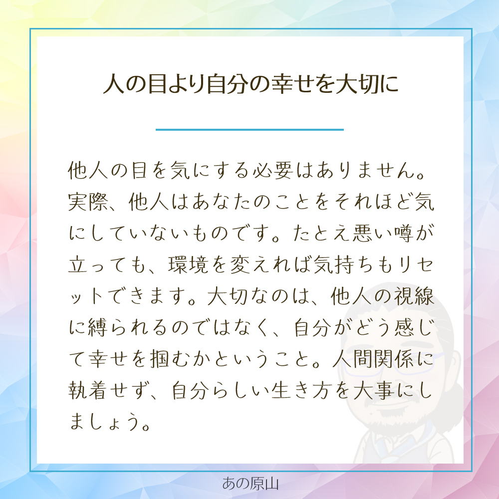私たちはつい、「人にどう思われるか」を気にしてしまいます。でも、よく考えてみてください。私たちが思っているほど、他人は自分のことを見ていません。誰もが自分のことで精一杯。ほんの一瞬、誰かがあなたのことを話題にしたとしても、次の瞬間にはもう別のことに夢中になっています。