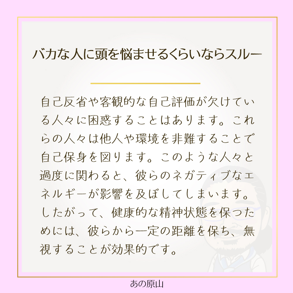 これらの方法を実践することで、自己反省のない人と健全な距離を保ち、あなた自身の心の平和を守ることができます。