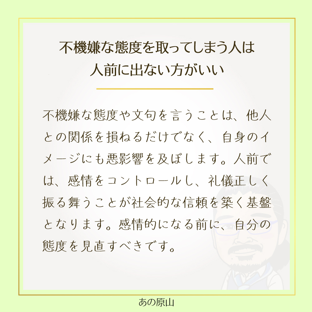 特に人前では、不機嫌な時こそ自分を抑え、上機嫌に振る舞うことが大切です。