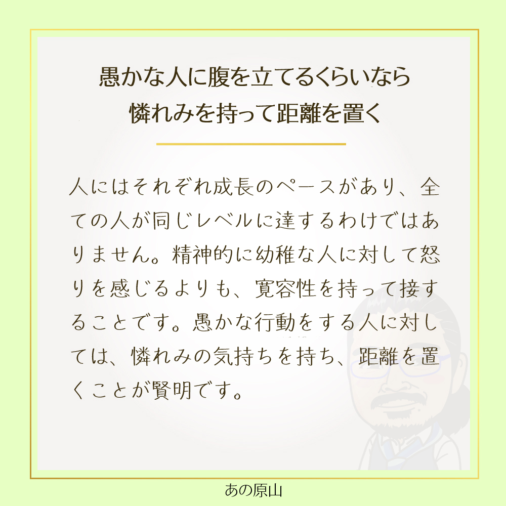 そのような人たちに対して怒りを感じるのではなく、憐れみを持ち、取り合わないようにすることが大切です。