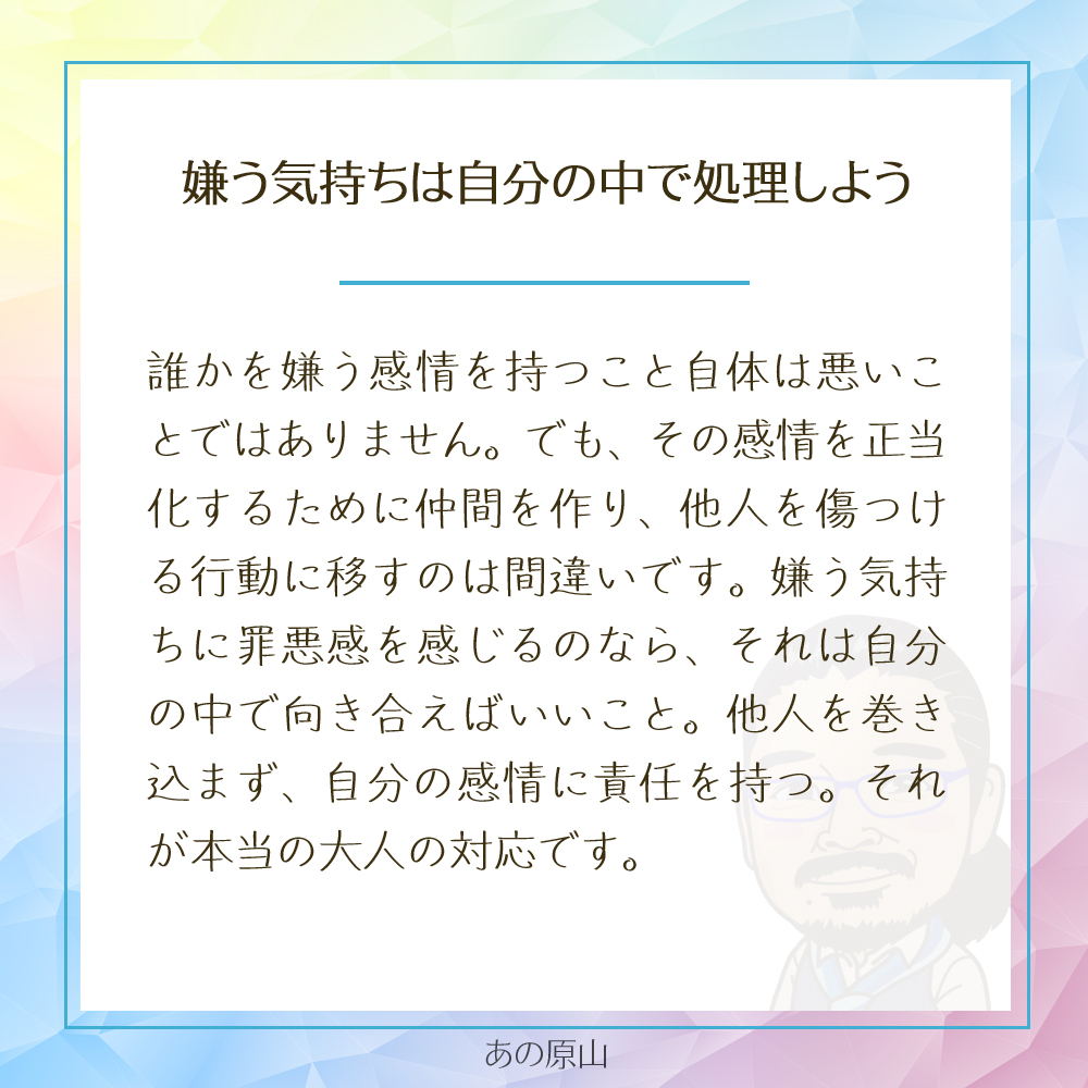 感情は自然に湧いてくるもの。でも、行動は選べます。誰かを嫌いだと思っても、それを周囲に言いふらすか、静かに距離を取るかは、自分で決められることなんです。