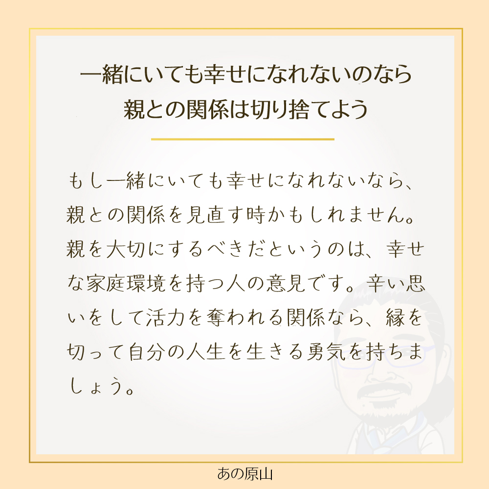 もし、親との関係が苦しく、あなた自身の幸せが損なわれているなら、関係を見直す時期かもしれません。