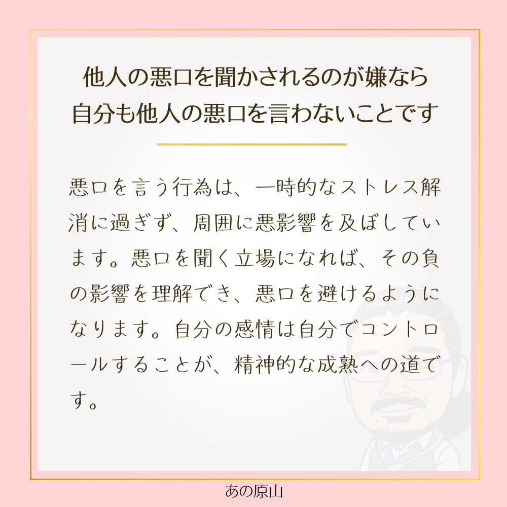 他人の悪口を聞かされる立場になってみると、悪口を言おうとは思わなくなるものです。