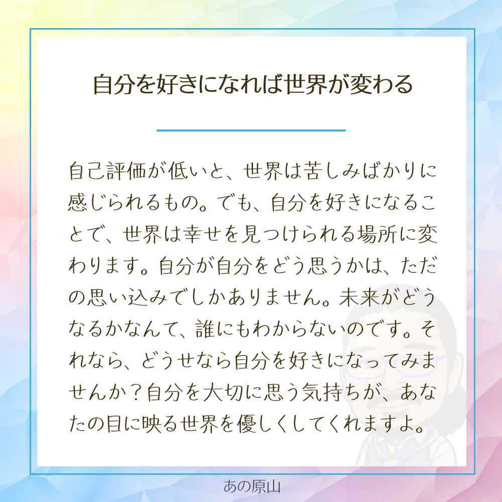このように、自己評価が低いと、世界はどんどん苦しさや不安で満ちた場所に見えてしまうのです。
