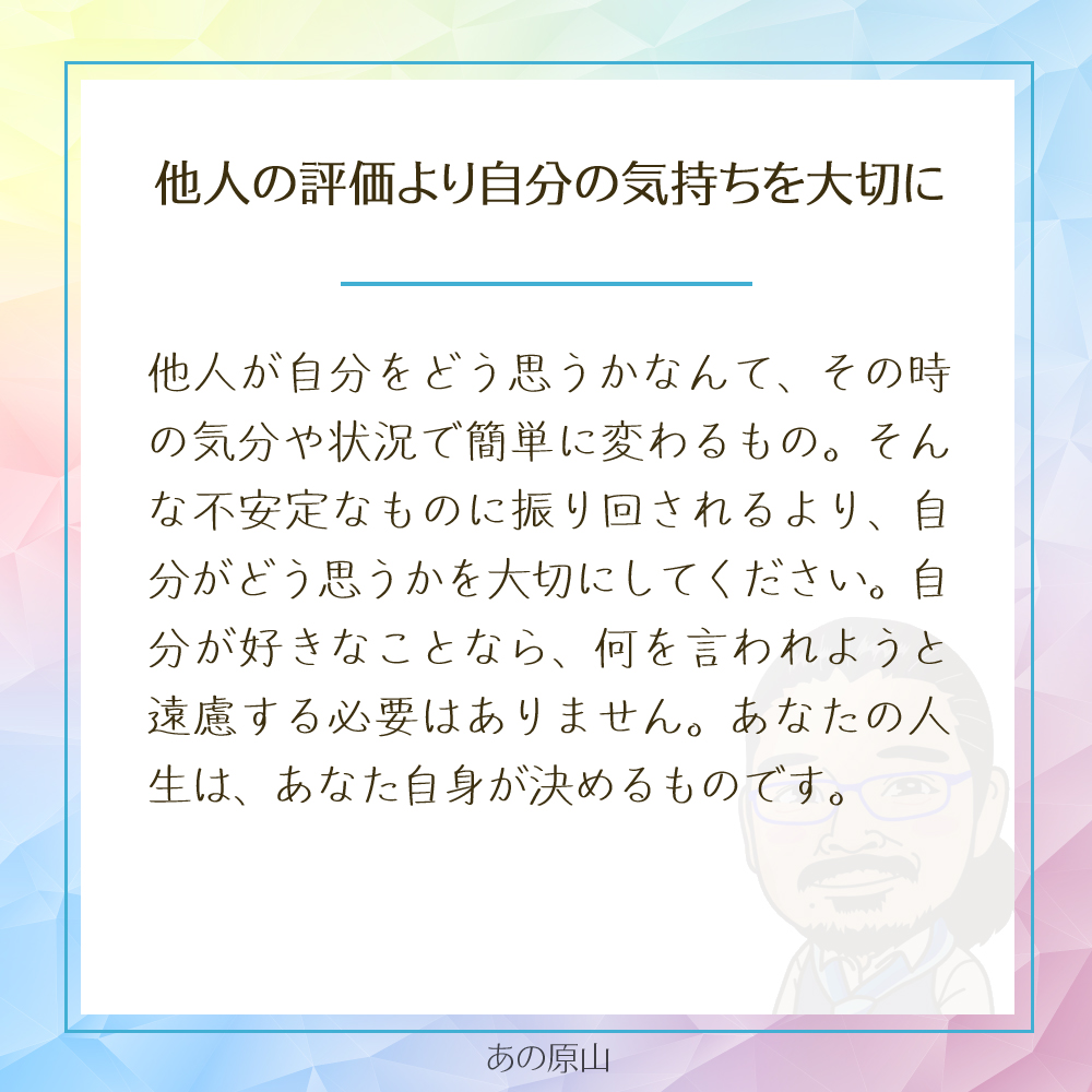 他人の目に振り回されることなく、自分が心地よいと感じる生き方を選んでいってくださいね。