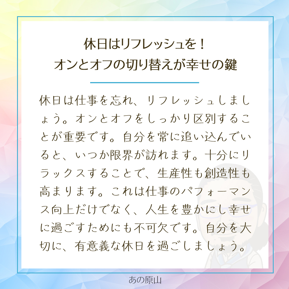 毎日一生懸命働いていると、つい休日も「少しだけ仕事のことを考えよう」と思ってしまうことはありませんか?