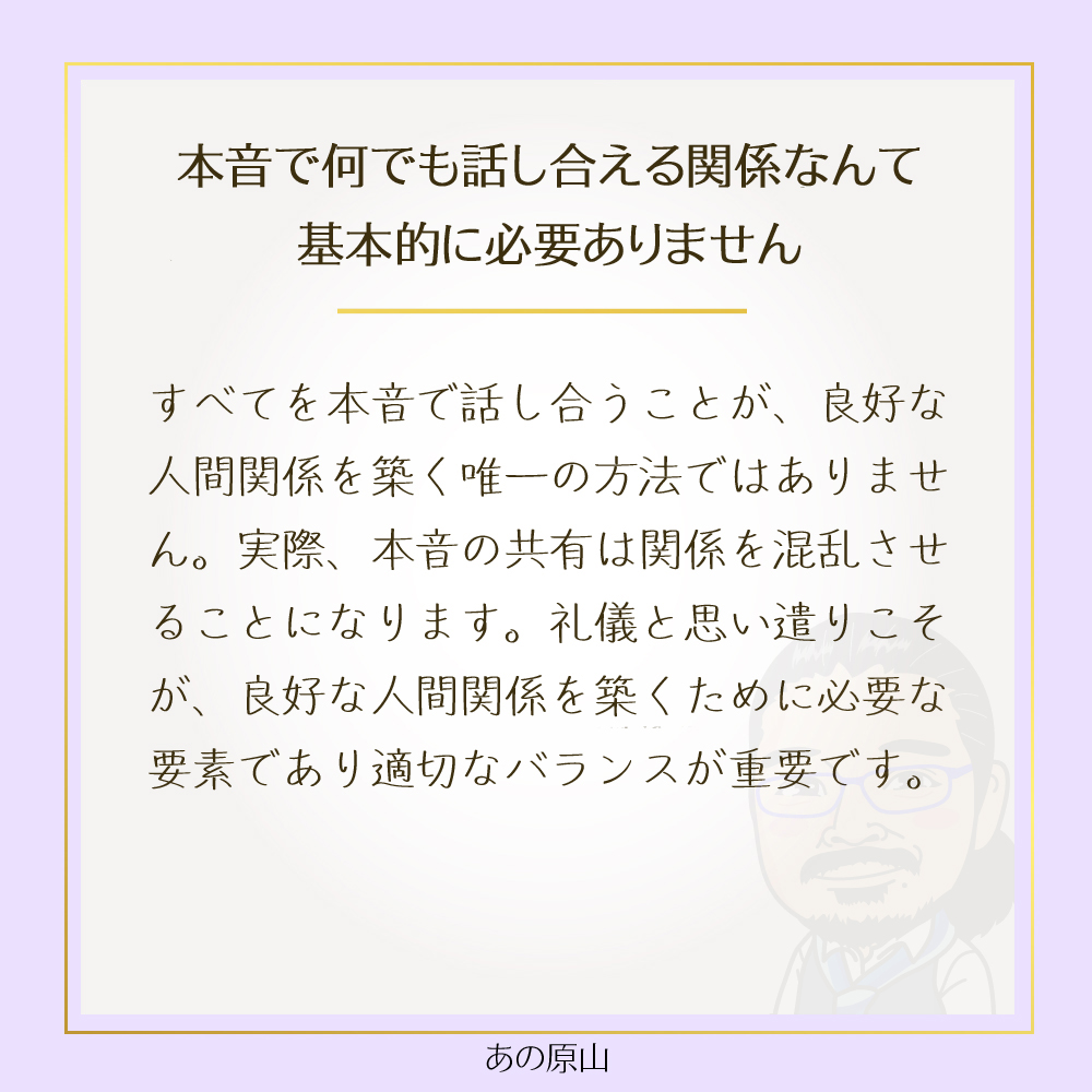 良好な人間関係に必要なのは、礼儀と思いやりであって、本音ではないのです。
