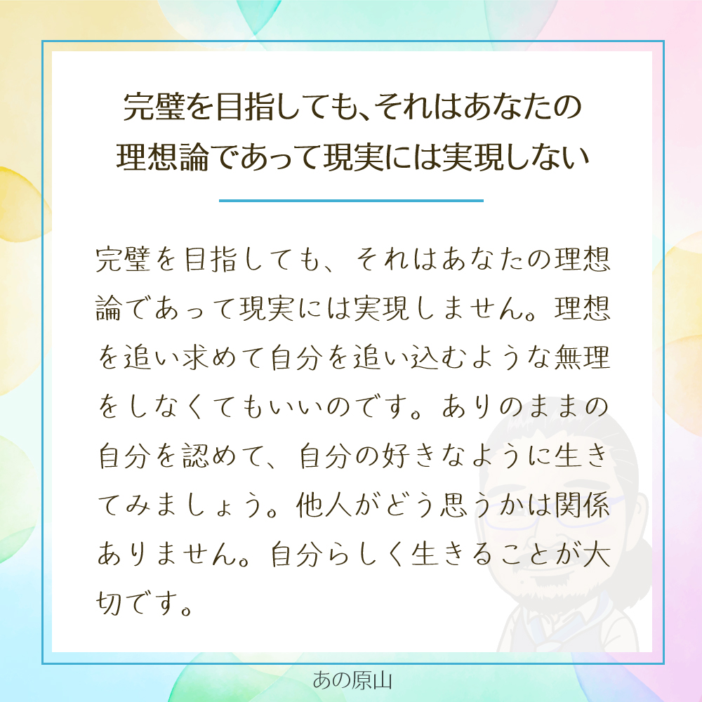 理想を持つことは大切ですが、完璧を求めすぎると、かえって自分を追い詰めてしまいます。