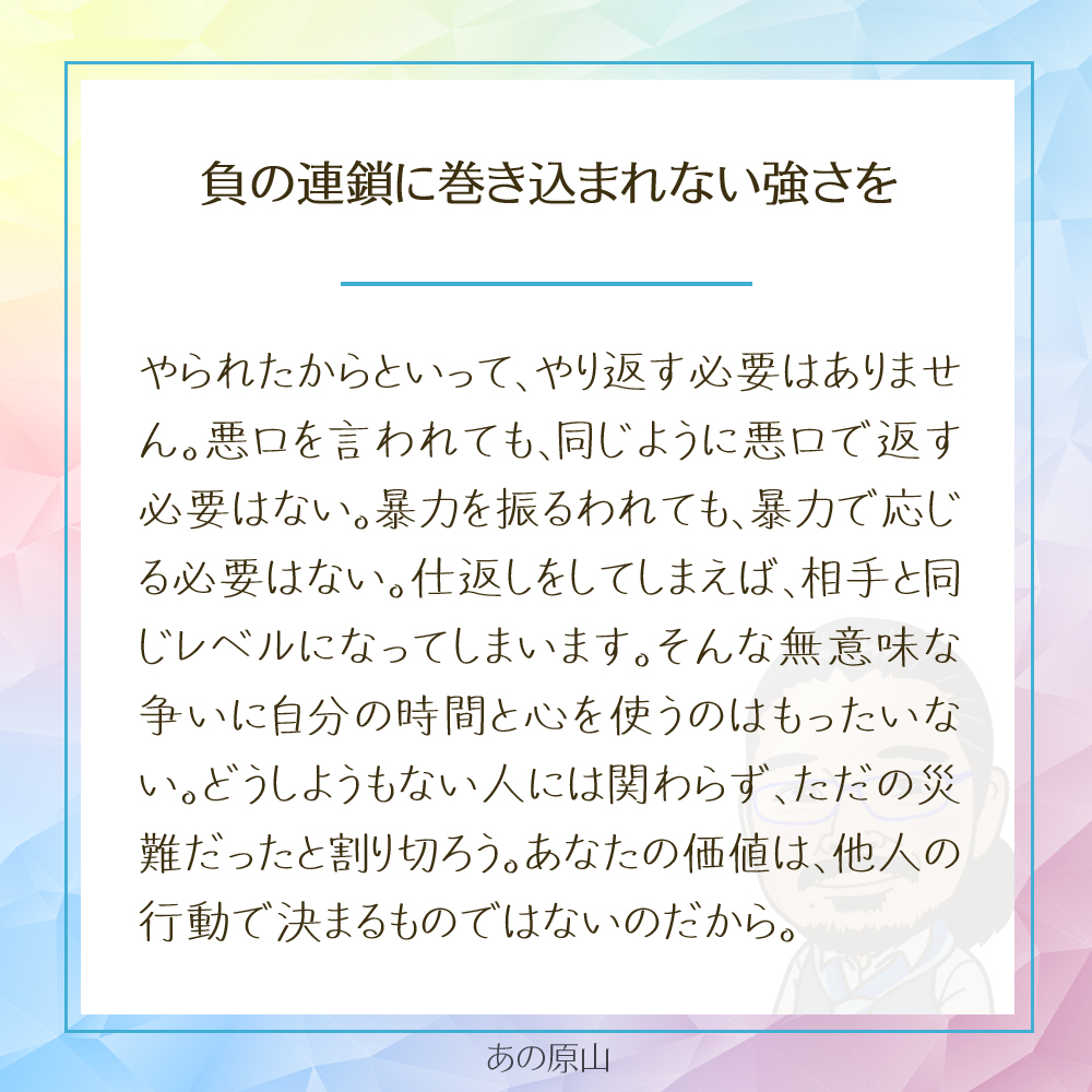 やられたからといって、やり返す必要はありません。悪口を言われても、同じように悪口で返す必要はない。暴力を振るわれても、暴力で応じる必要はない。そんな無意味な争いに巻き込まれず、災難と割り切って進むことで、心が穏やかになります。たとえば、週末に好きな本を読んだり、気の合う人と笑ったり。そんな時間が、あなたの心を満たします。