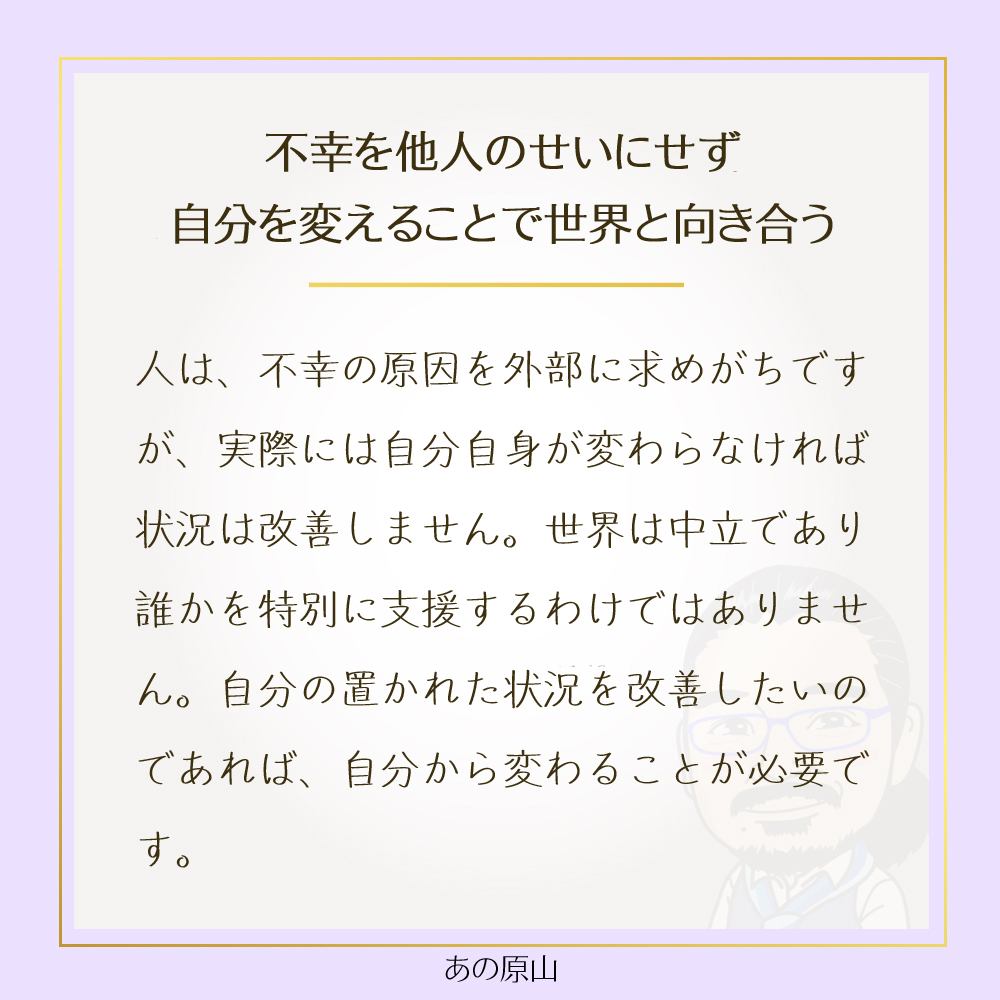 不幸の原因を他人に求めるのではなく、自分がどう行動するかに焦点を当てましょう。