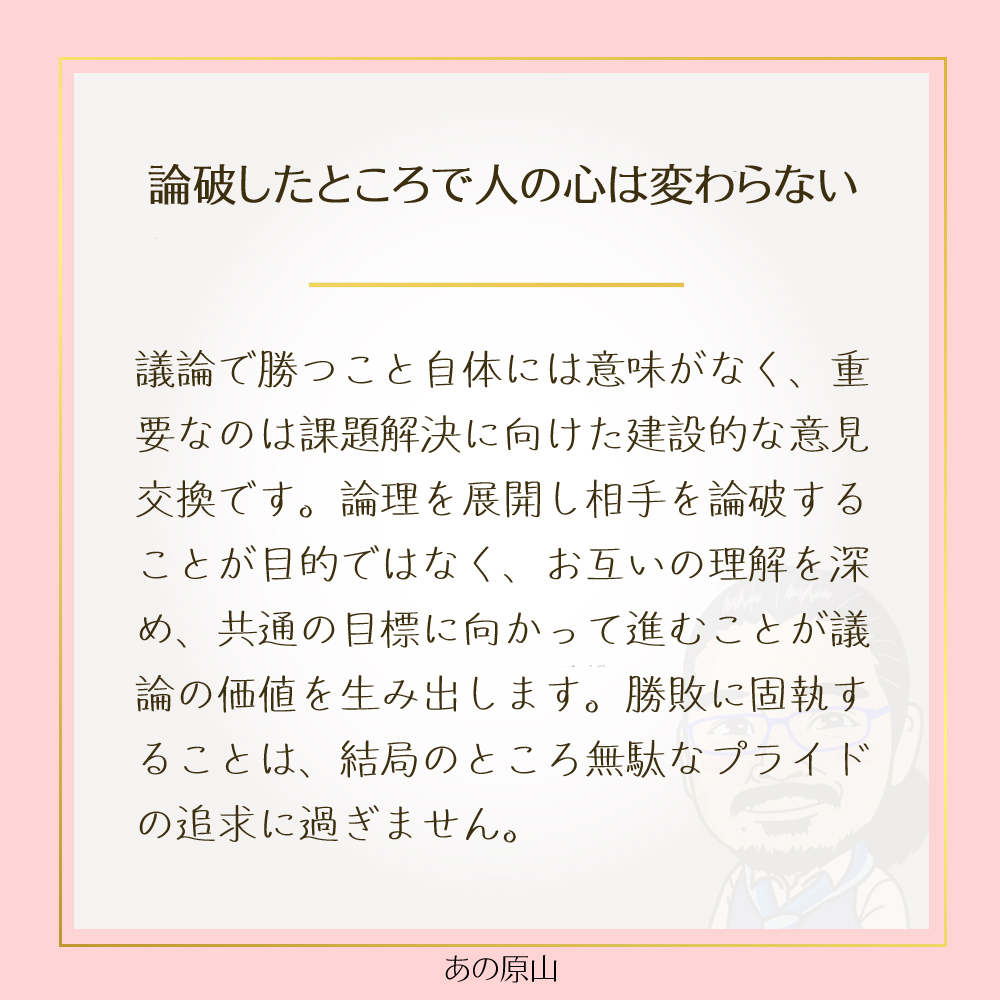 議論の本当の価値は、勝ち負けではなく、課題を解決するための意見交換にあります。