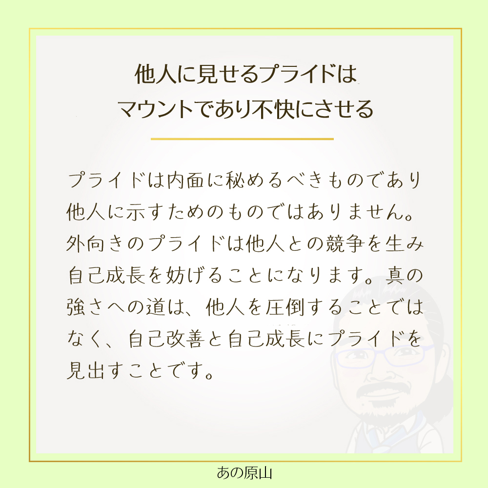他人に見せつけるプライドは、ただのマウントになりがちで、周りの人を不快にさせるだけでなく、自分自身の成長も妨げてしまいます。